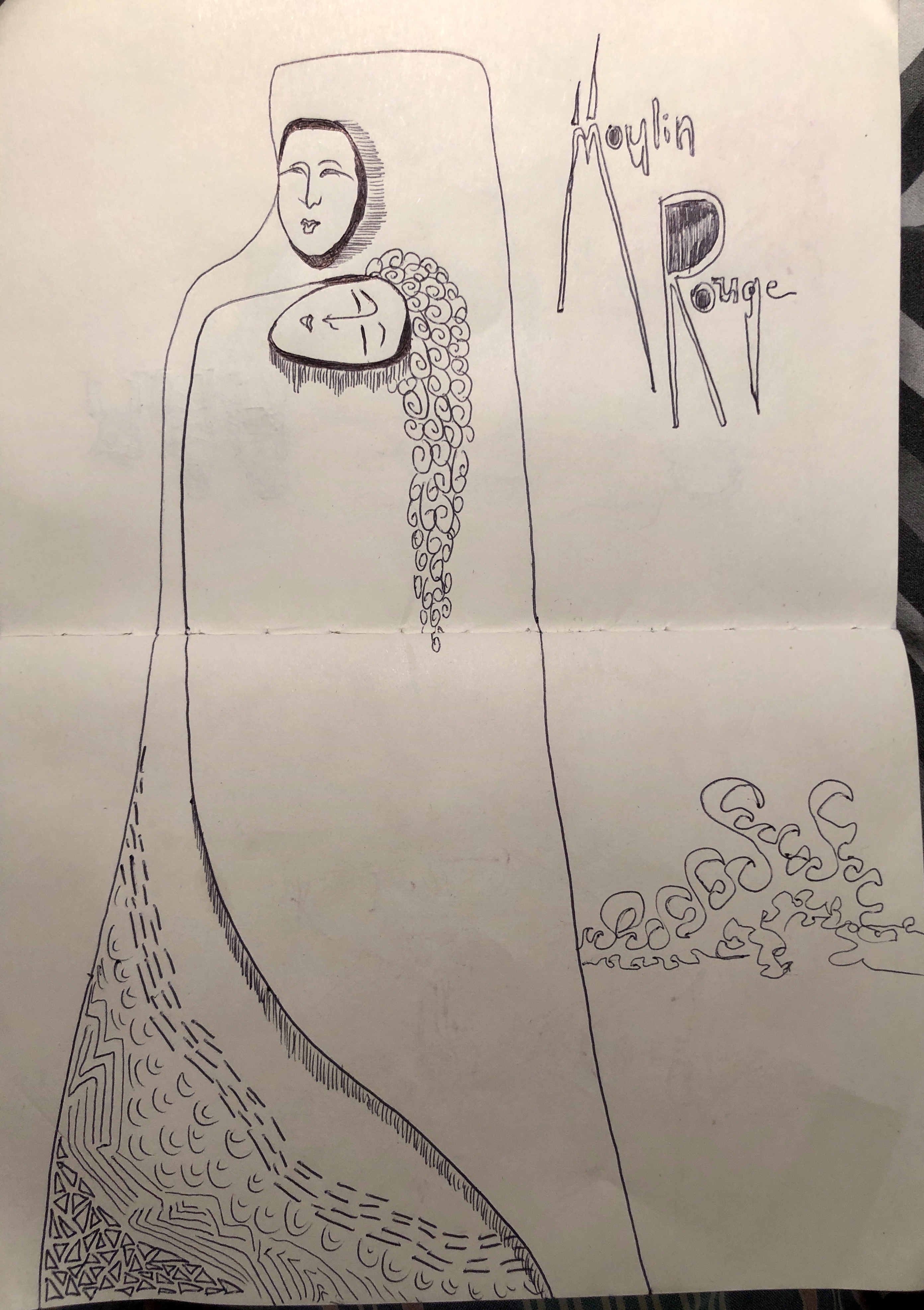The final sketch was inspired by not only Japanese art, but Gustav Klimt’s “The Kiss”, and posters of Moulin Rouge by Henri de Toulouse – Lautrec. I think all of the aforementioned works succeed in projecting a tangible spirit, despite having only two dimensions, and flat with intentions. I wanted to experiment with the idea of how space can be represented in a picture that squashes it with intention.